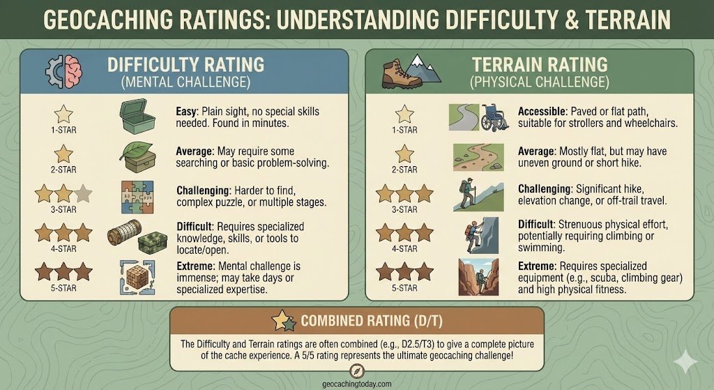 The rating system for geocaches is basically your treasure hunt GPS—it gives you a pretty good idea of what you’re walking into before you even get started.